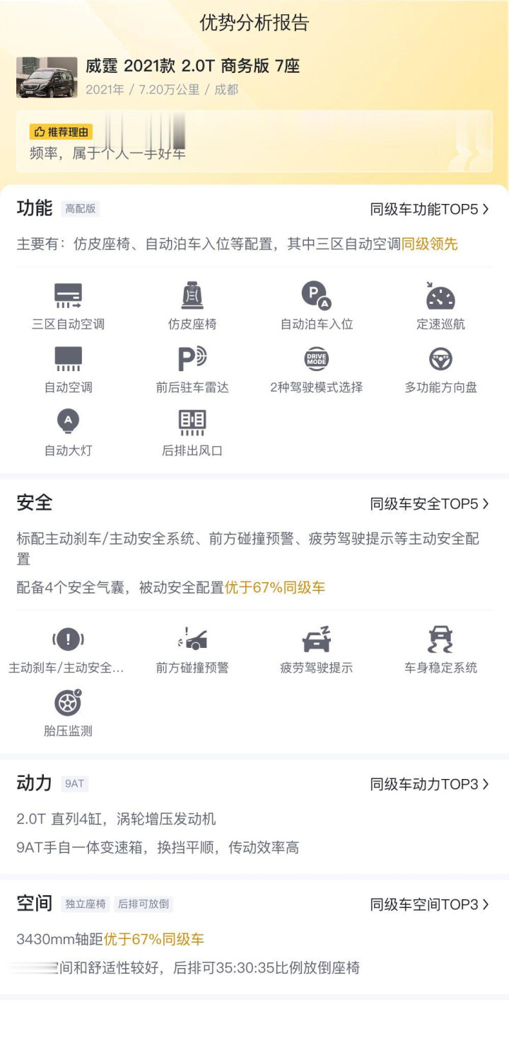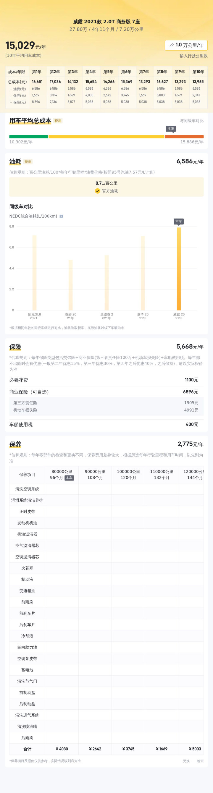 据估算,同级车的最低用车成本是13980元/年,最高是17724元/年,威霆 2021款 2.0T 商务版 7座是15765元/年,所以用车成本适中。